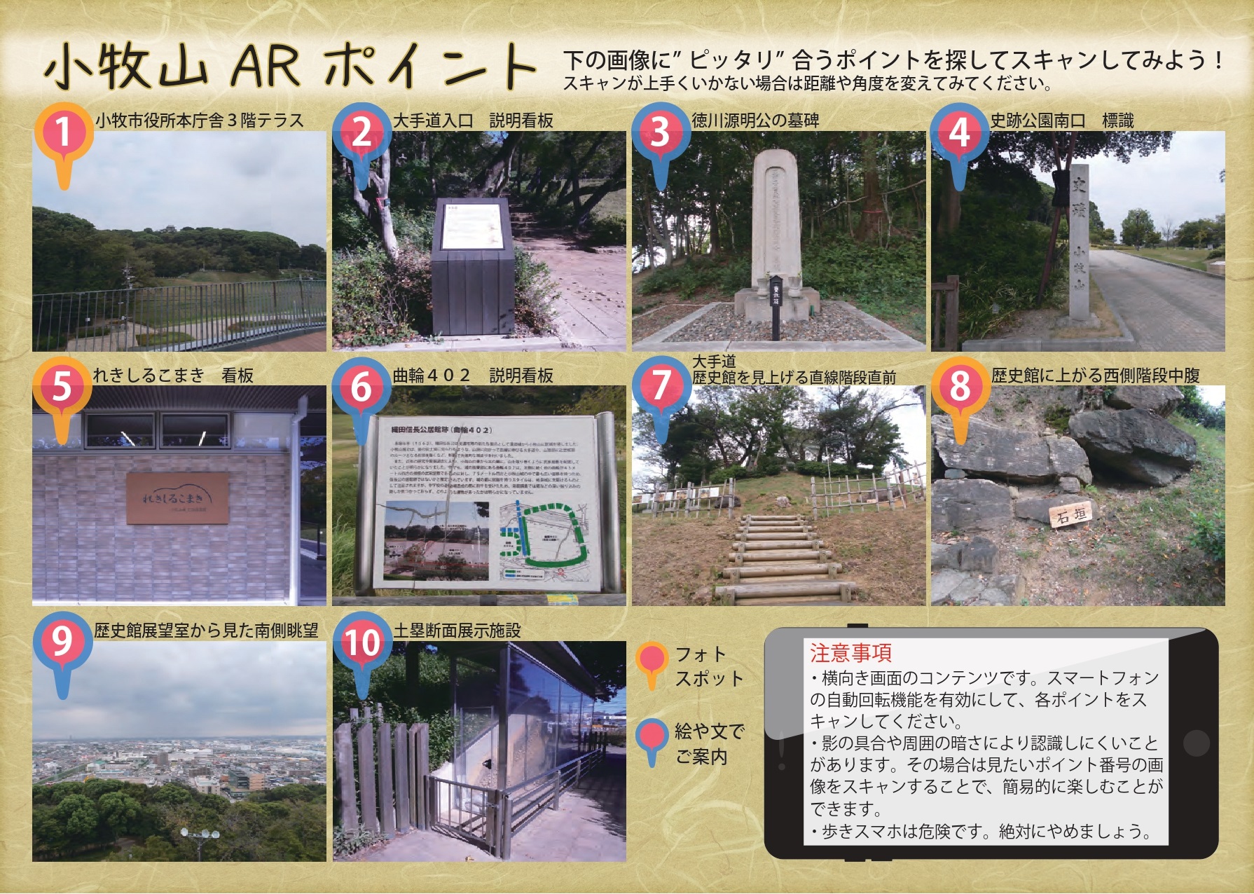 詳しくは下記チラシをご覧いただき、スマホを片手に、ぜひ小牧山を散策してみてください♪